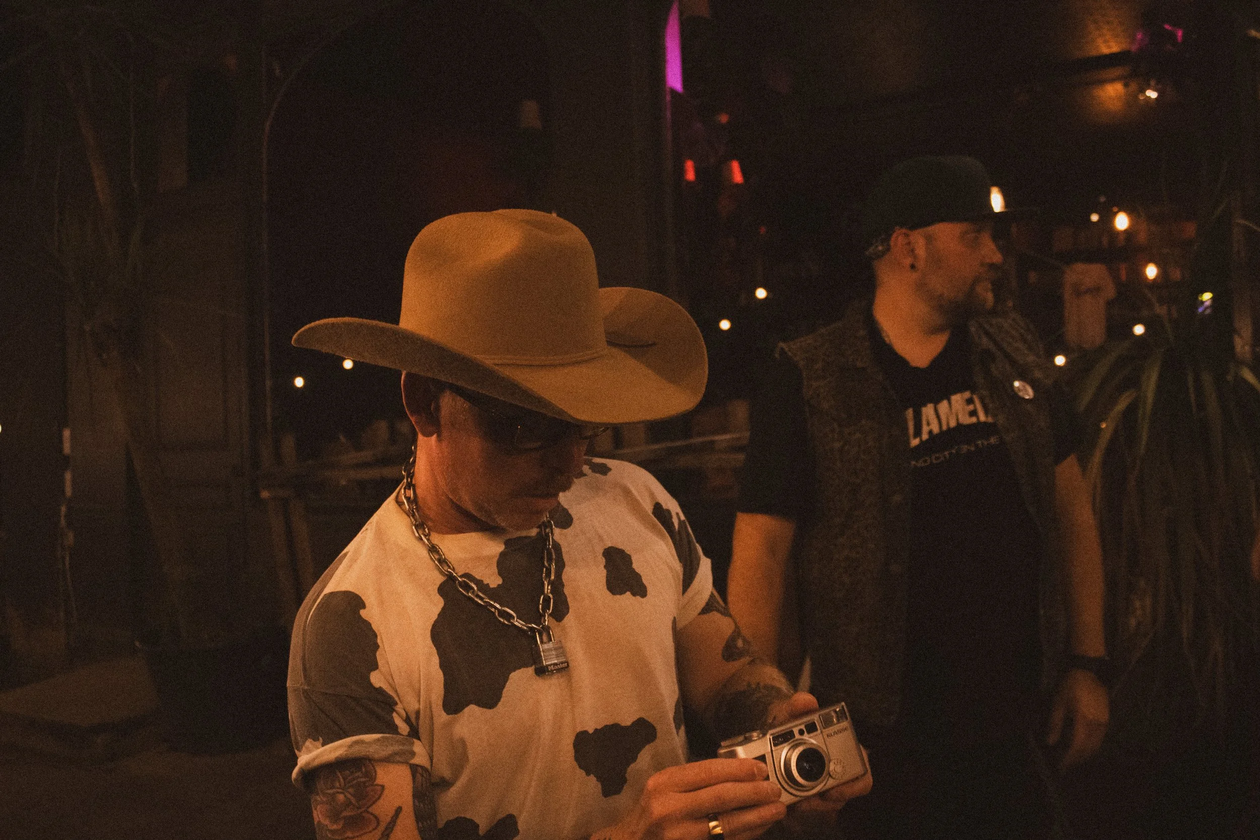 A man wearing a large cowboy hat, sunglasses, and a cow-print t-shirt is holding a vintage camera in a dimly lit room, with another man standing nearby.