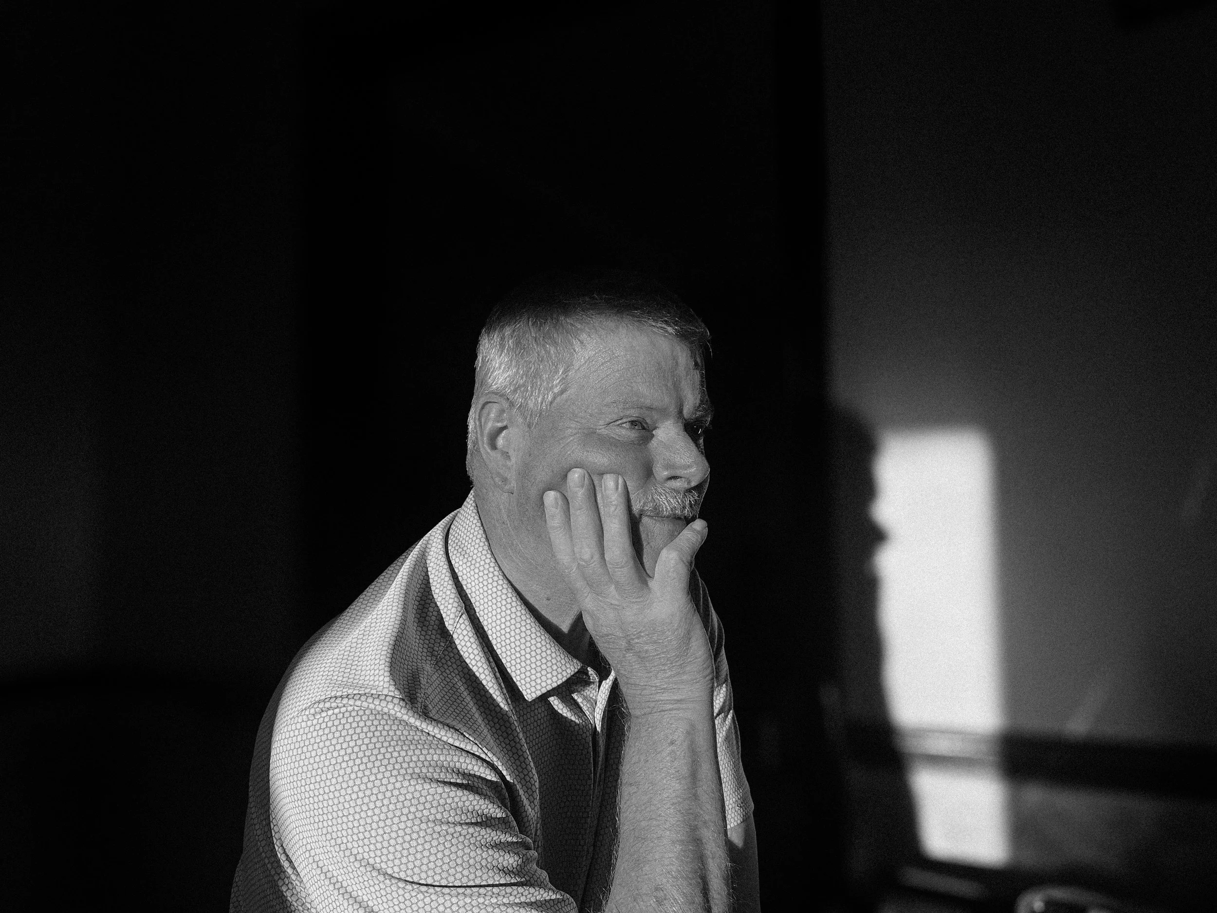 A black and white photo of a middle-aged man with short hair and a mustache, resting his face on his hand, looking contemplative or thoughtful, with a shadow of his profile cast on the wall behind him.