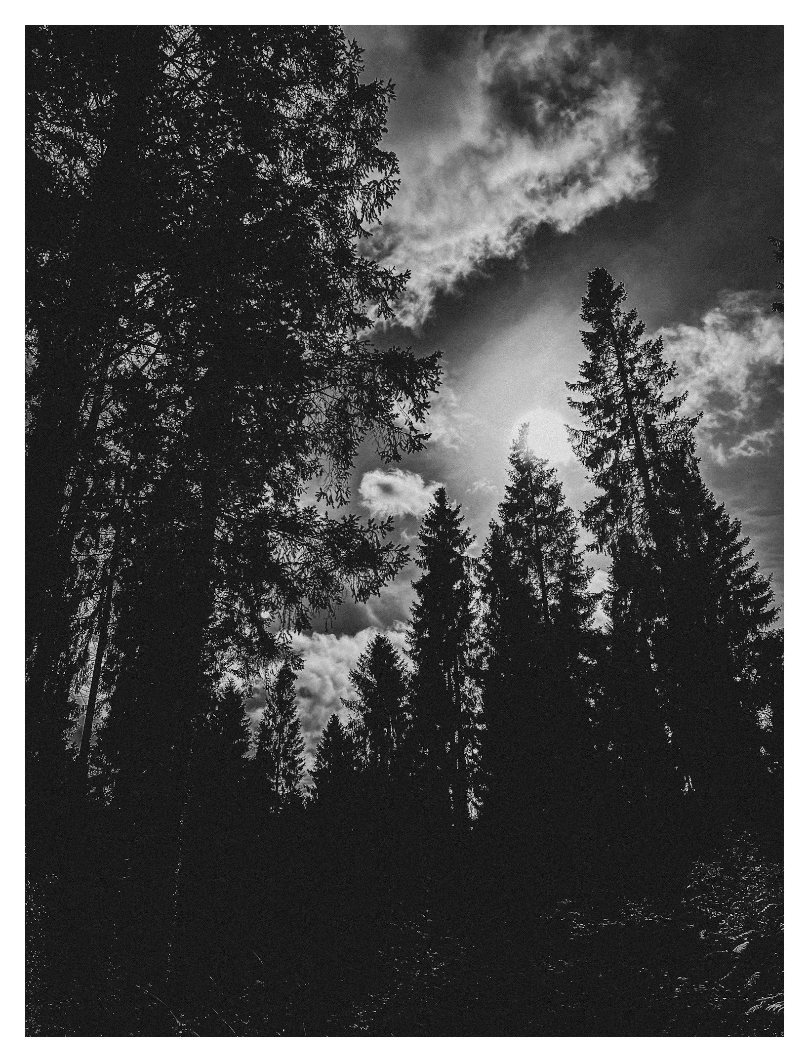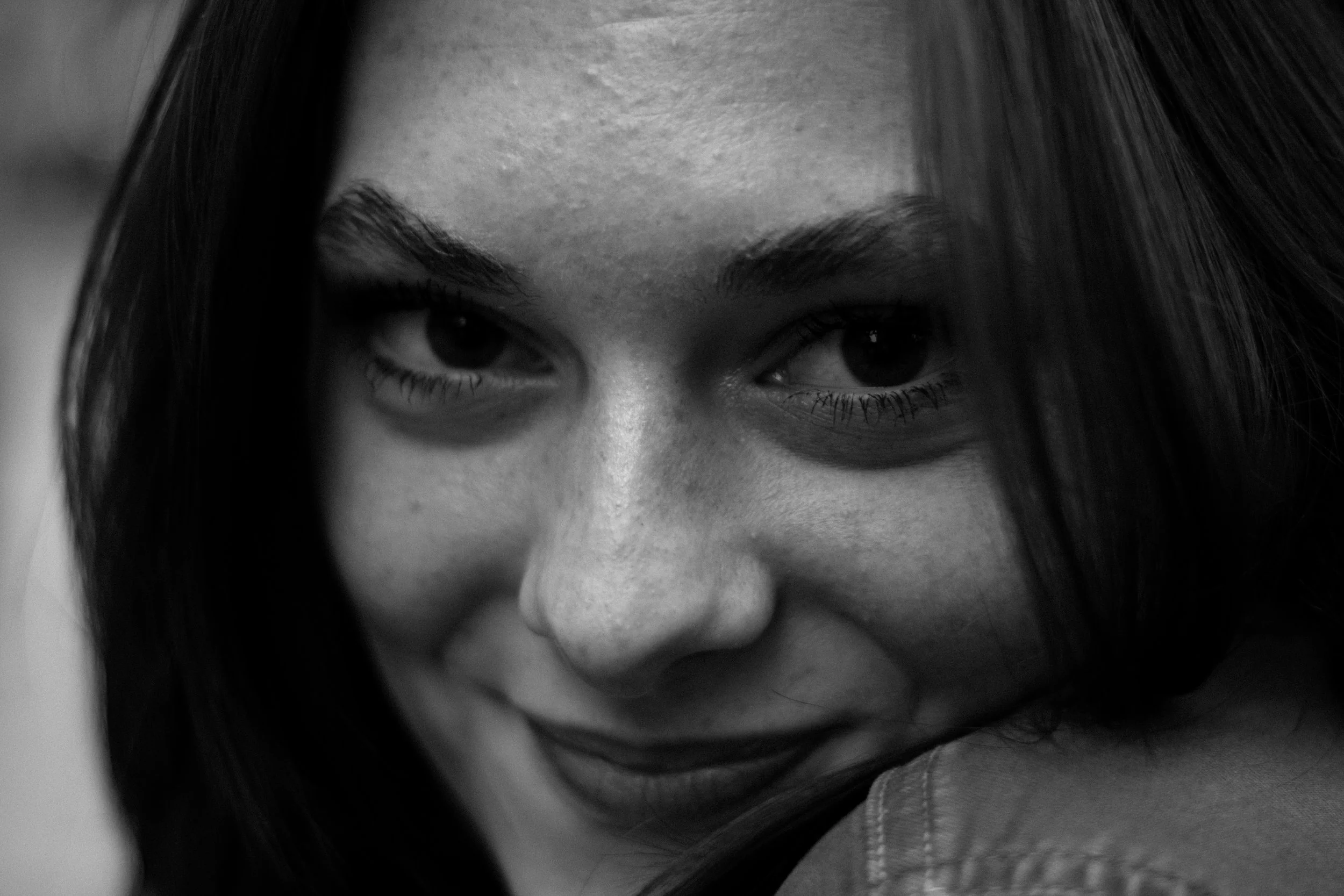 Close-up of a young woman's face with a playful smile and partially hidden mouth, black and white photograph.