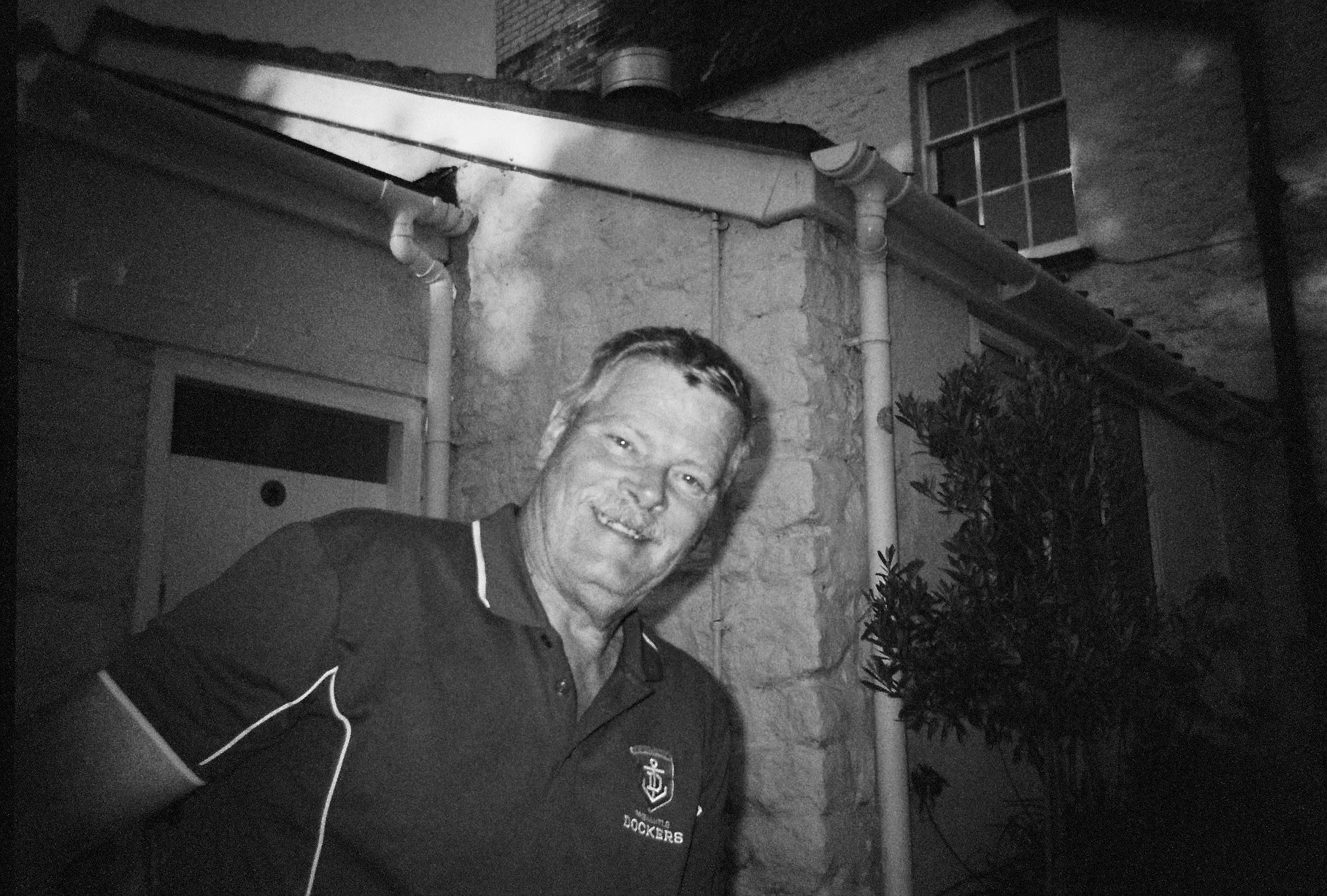 A man smiling outdoors at night in front of a brick wall with pipes and a window. The Blaise Inn Garden.