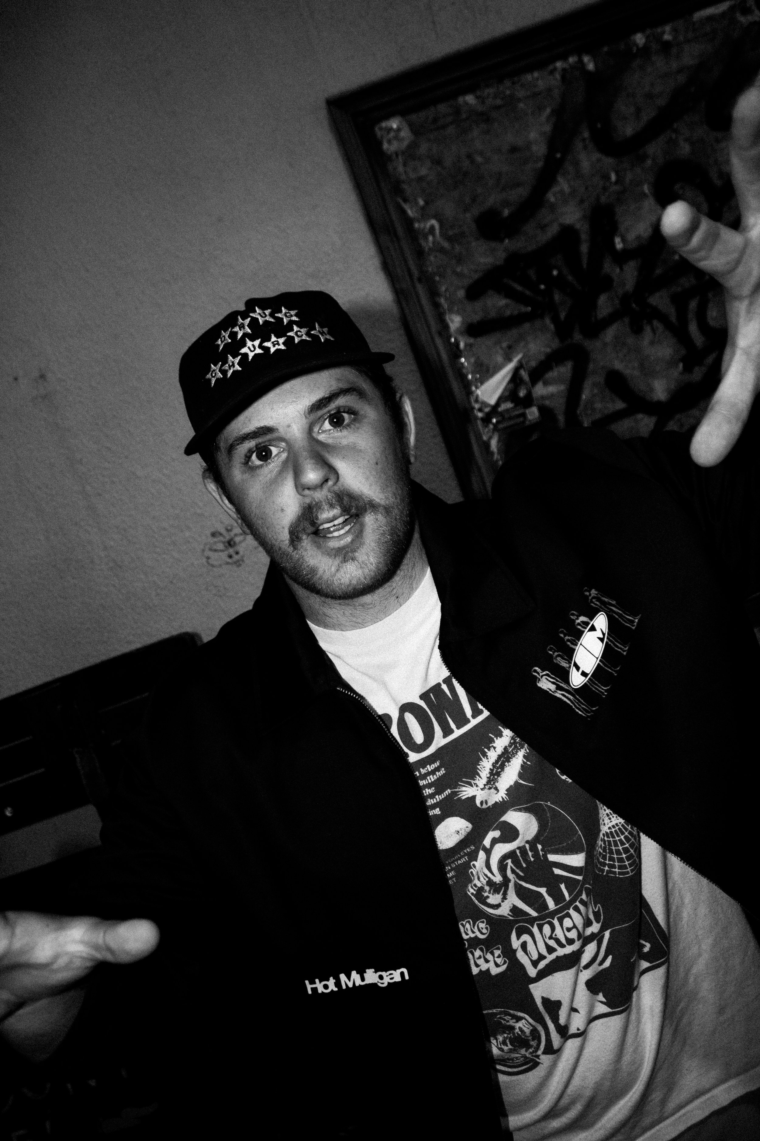 A young man with a mustache and beard wearing a black cap with stars, a black jHot Mulligan jacket with patches, and a graphic T-shirt.