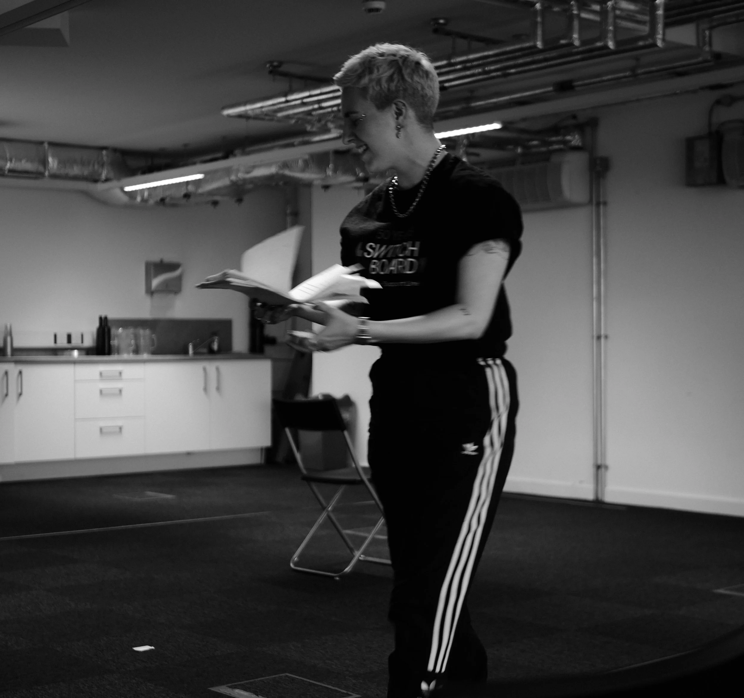 A person with short hair, wearing earrings, a necklace, a black T-shirt with text, and black Adidas track pants with white stripes, is holding and reading a notepad in a room with visible ceiling pipes and kitchen cabinets.