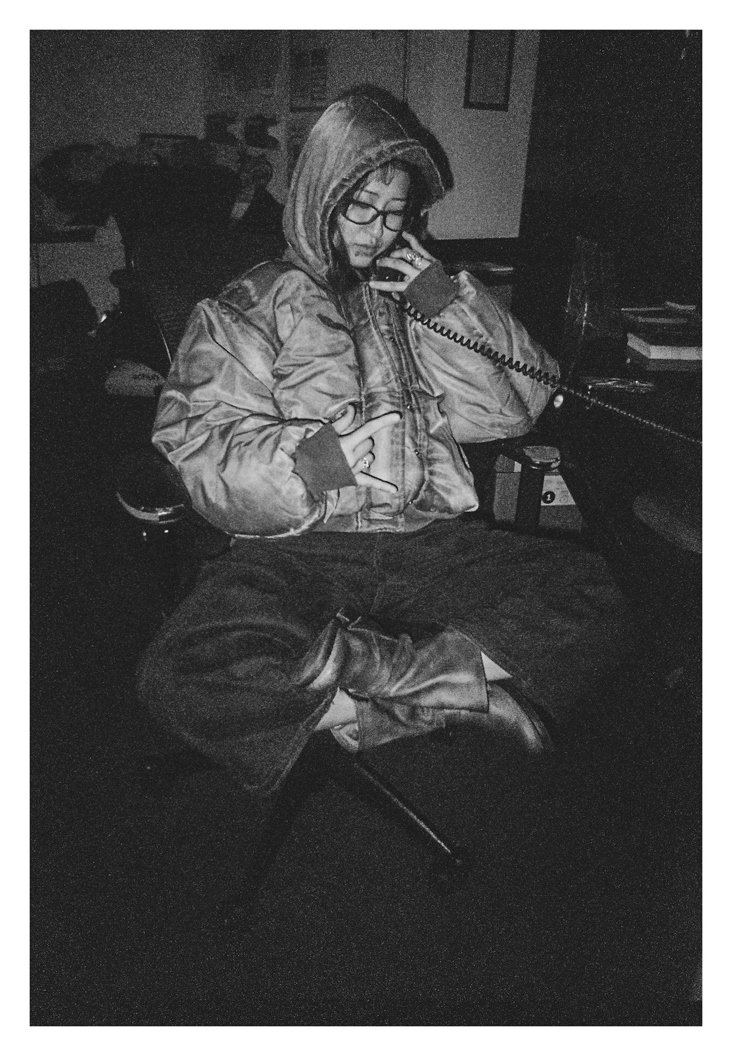 A person wearing glasses, a hooded jacket, and dark pants sitting on a chair, holding a corded phone with one hand and making a rock sign with the other hand.