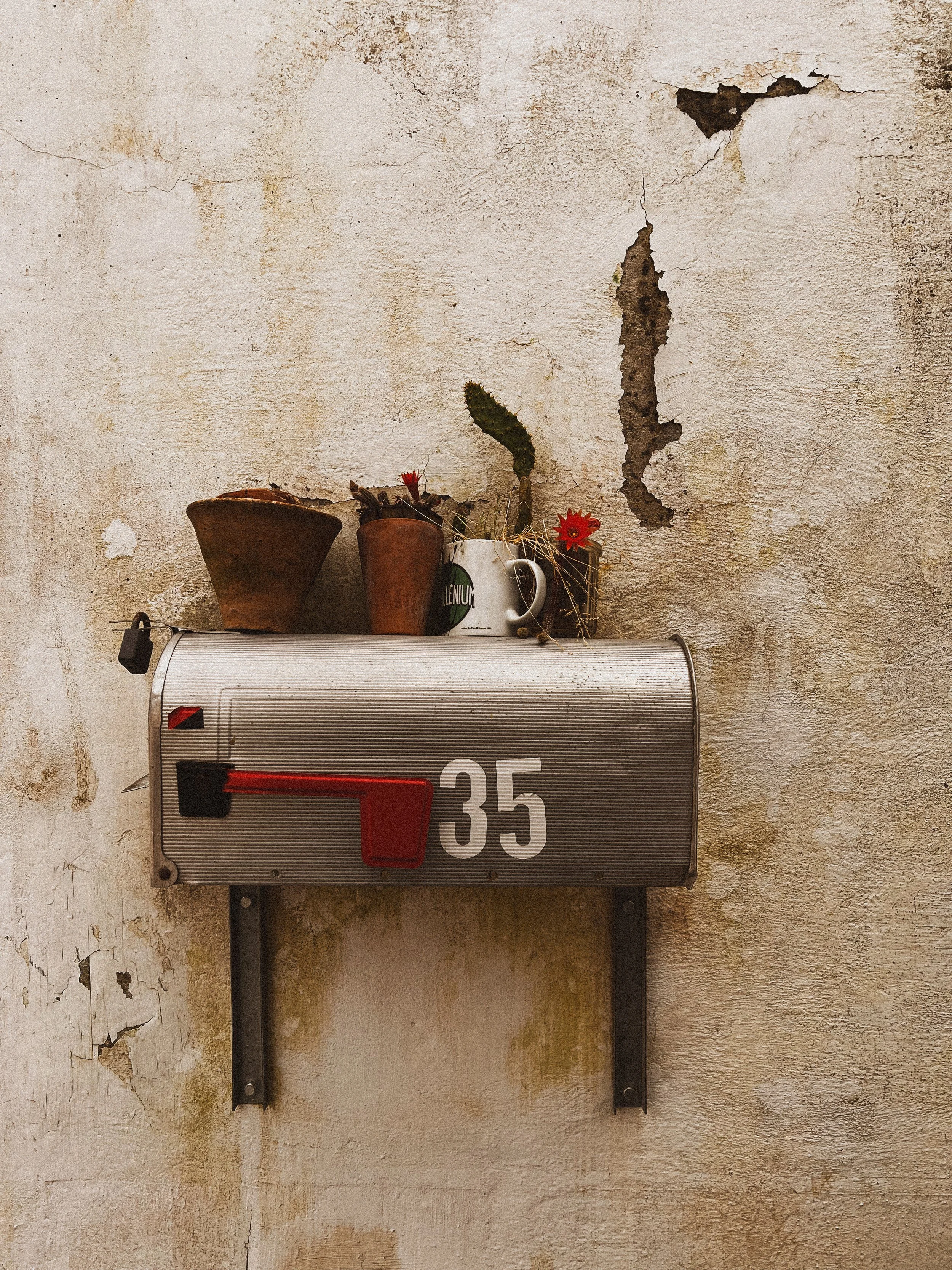 A vintage mailbox with the number 35, decorated with small potted plants and flowers on top, against a weathered wall with peeling paint and cracks.
