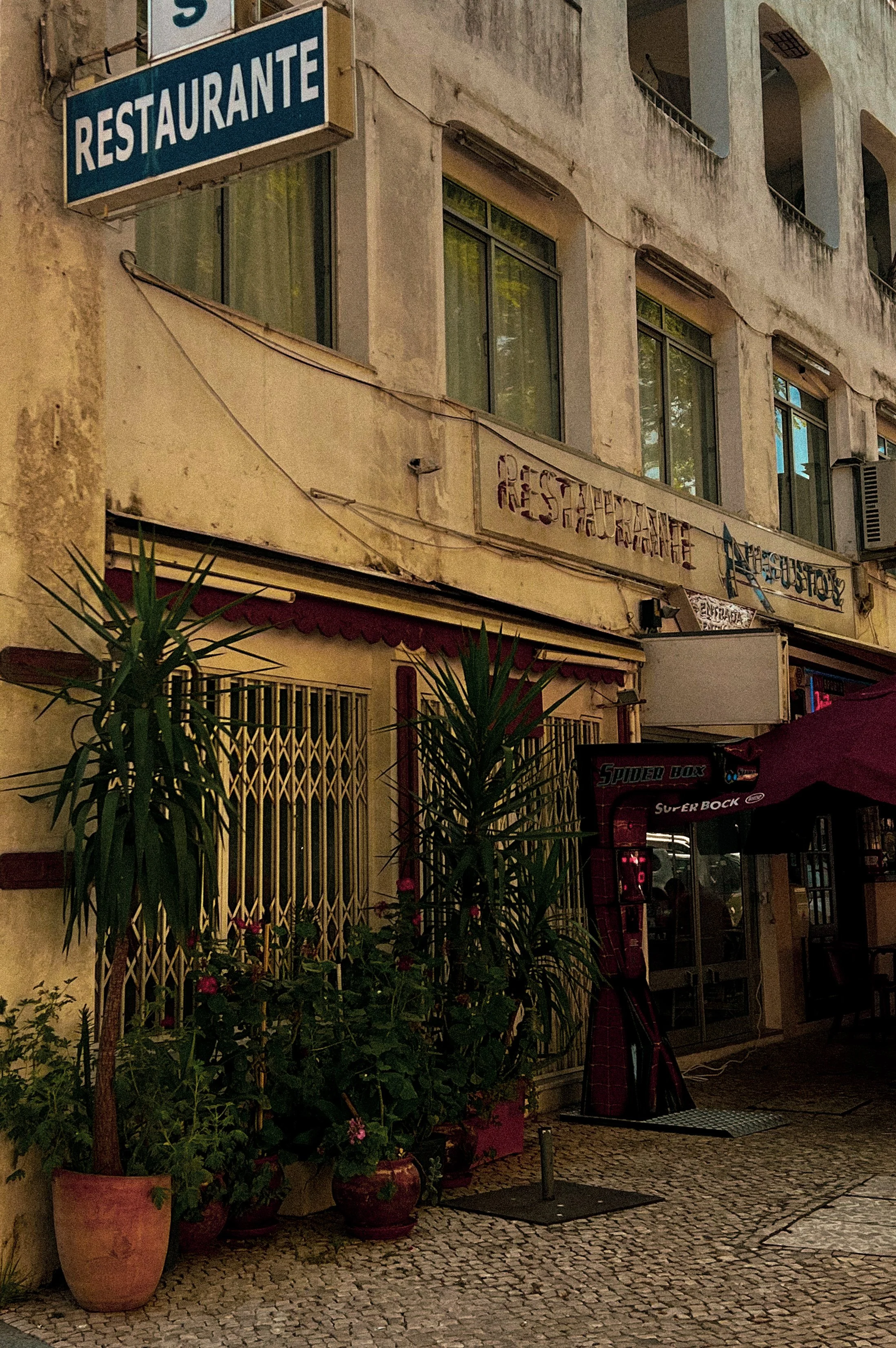 Outdoor scene of a weathered building with a restaurant sign, potted plants, and an arcade game machine outside.