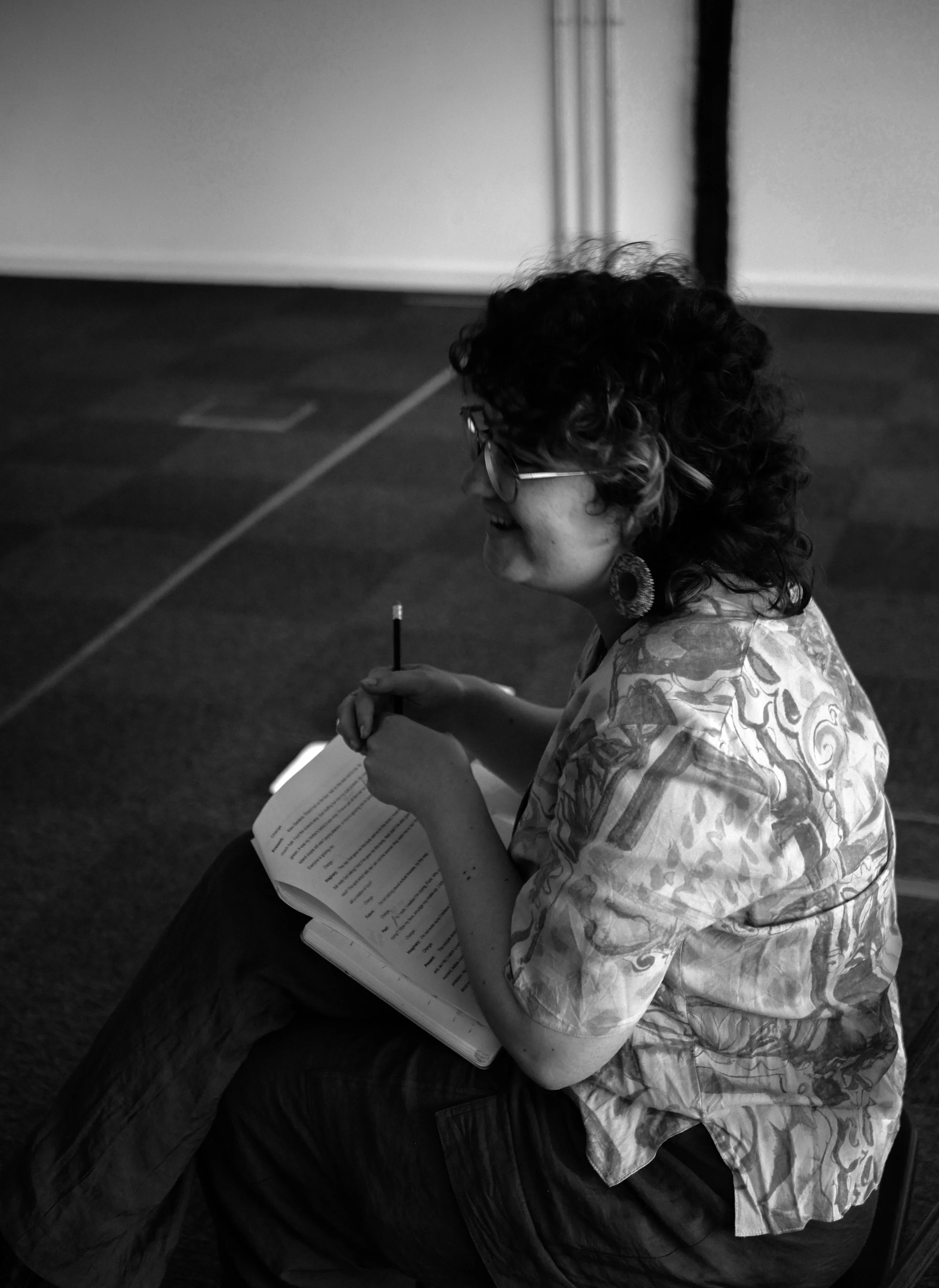 A woman with curly hair and glasses sitting on the floor, holding a notebook and writing with a pencil, smiling and engaged. Director of a play.