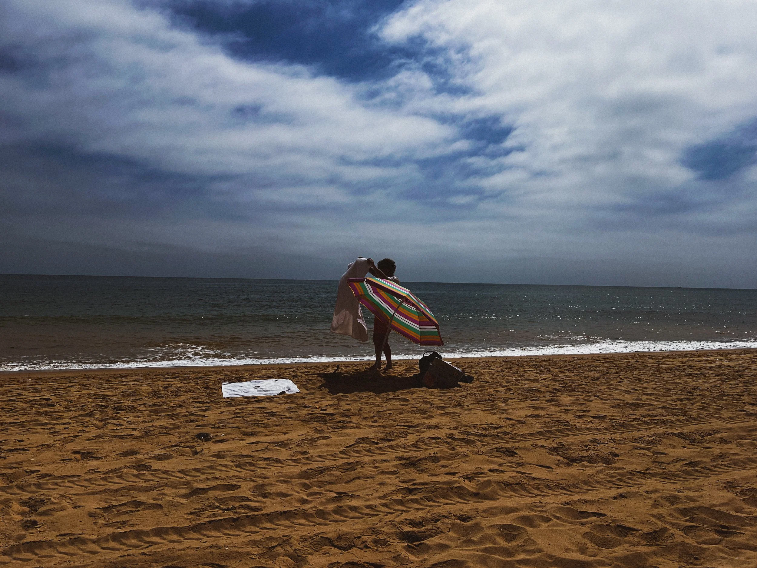 Person holding a striped beach umbrella on a sandy beach in Quarteria with the ocean and cloudy sky in the background.
