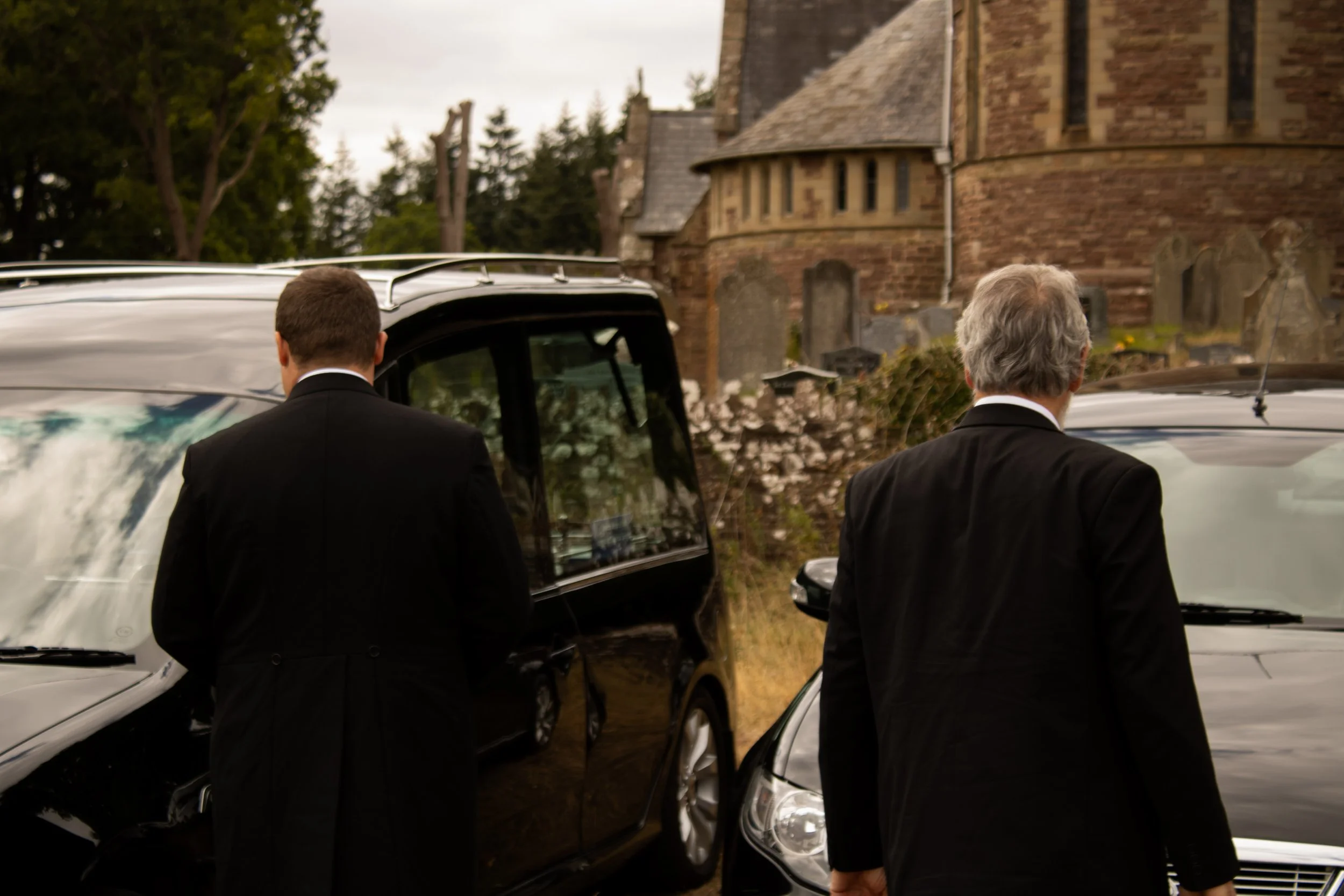 Two men in black suits standing outdoors near a black car, with an old stone building and trees in the background. Church and funeral cars.