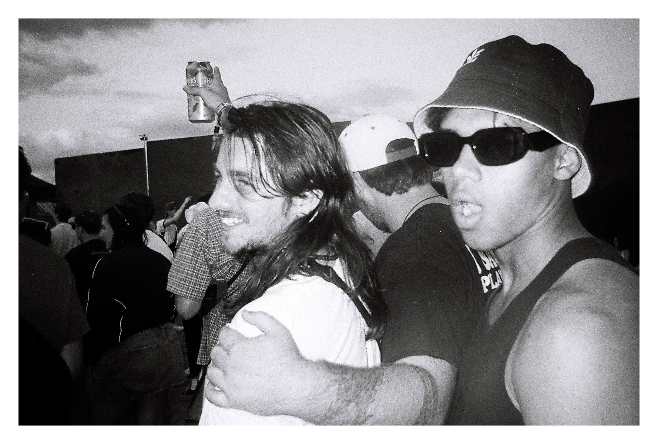 Two young men at an outdoor event, one smiling and the other with a serious expression, wearing sunglasses and a bucket hat, with a crowd in the background.