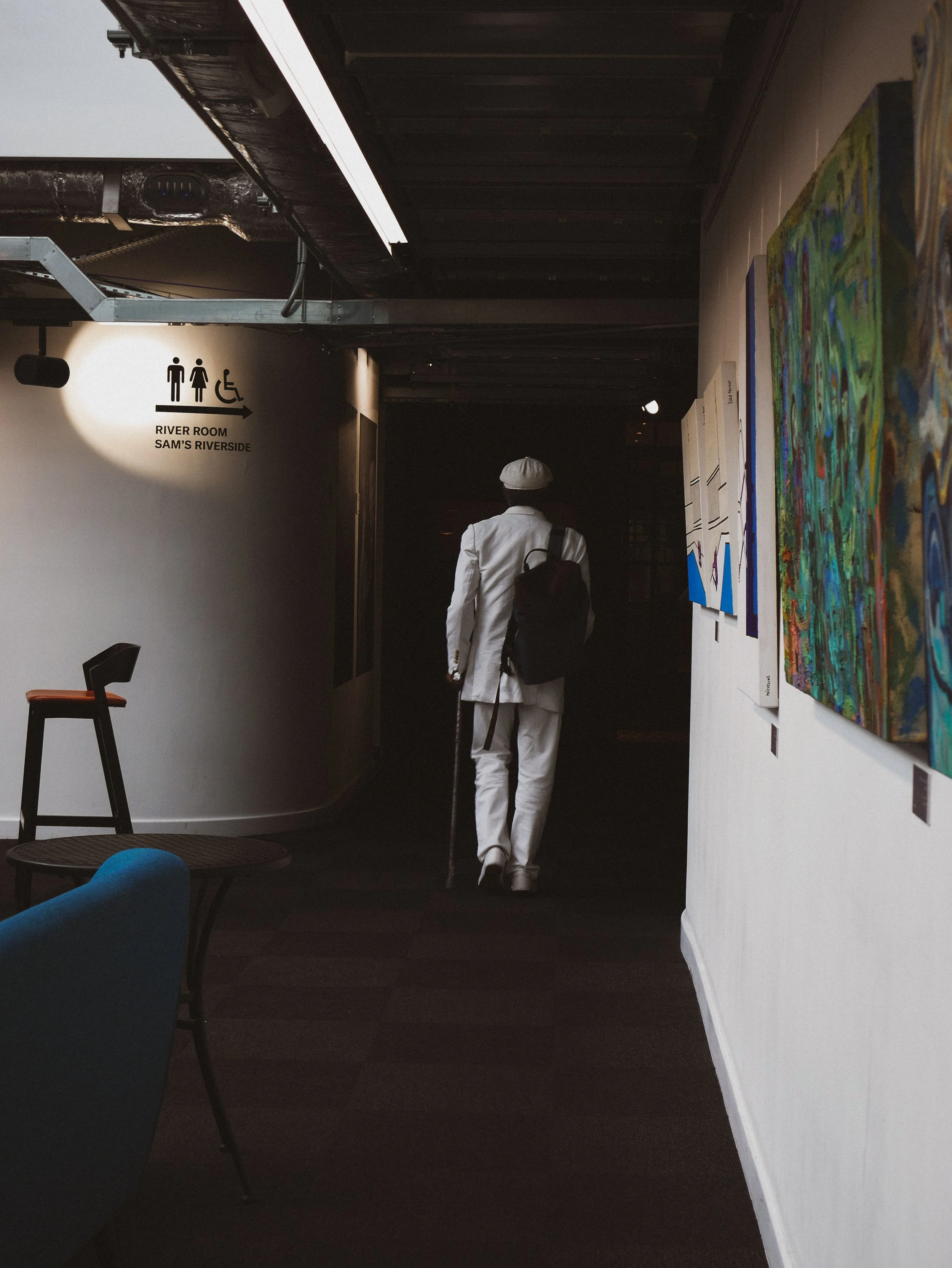A person dressed in white with a white hat, carrying a black backpack and using a cane, walking through an art gallery or museum corridor with paintings on the right wall. Riverside Studios.