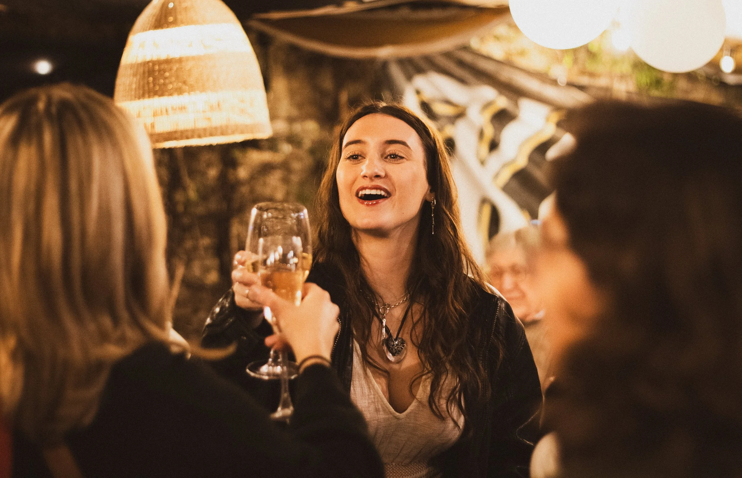 Group of women having a toast with wine in a cozy, warmly lit indoor setting.