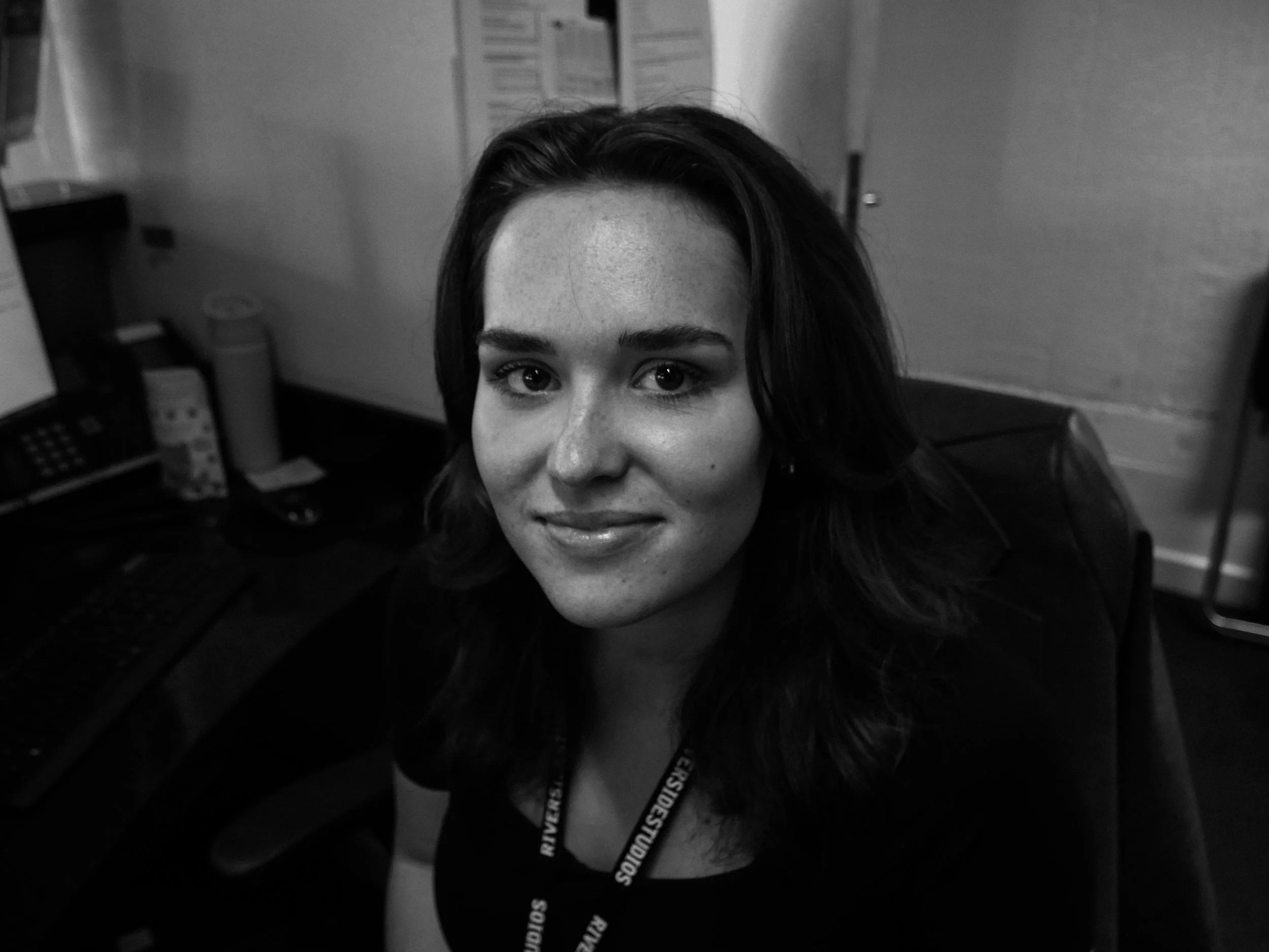 Black and white photo of a woman with dark hair sitting at a desk in an office, smiling at the camera with a computer, phone, and office supplies in the background.