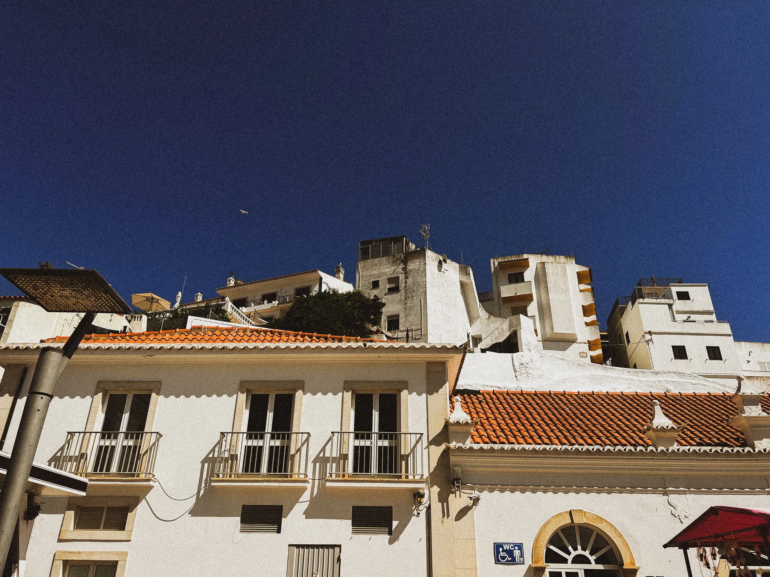 Cityscape with white buildings and orange-tiled roofs under a clear blue sky.
