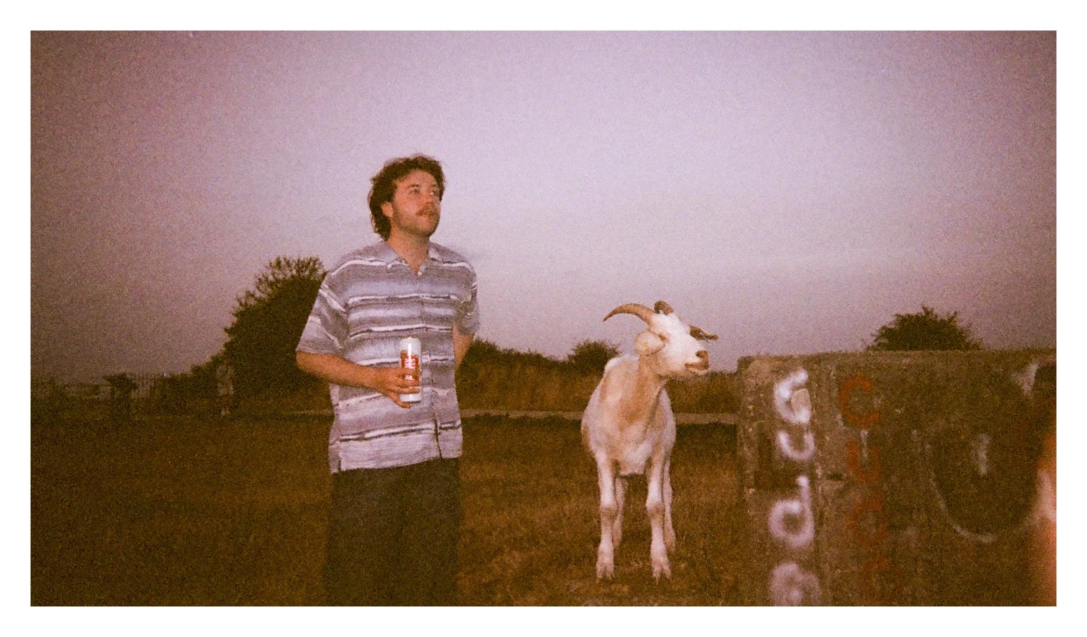 A man holding a drink standing next to a goat on a farm at dusk, with a wooden fence and trees in the background.